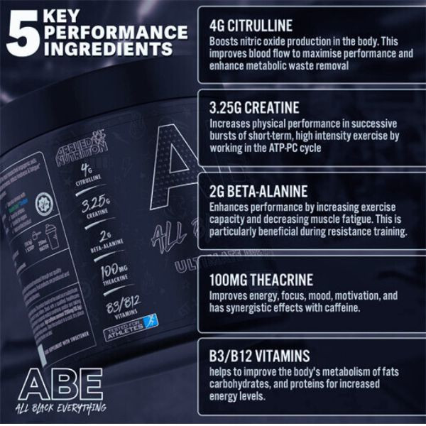 ABE (All Black Everything) by Applied Nutrition is a high-performance pre-workout supplement designed to enhance energy, focus, and endurance during intense physical activity. Formulated with a blend of scientifically backed ingredients, it is aimed at athletes, fitness enthusiasts, and individuals looking to maximize their workouts. The product delivers a potent energy boost, improves blood flow, and enhances mental clarity, ensuring users get the most out of their training sessions.