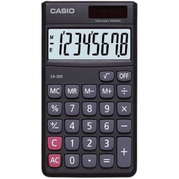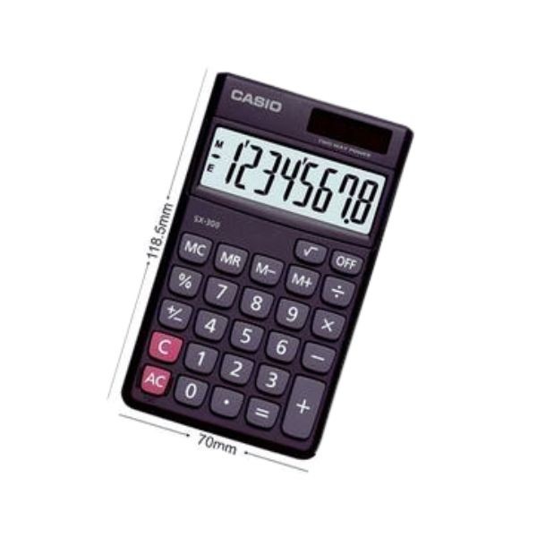 The Casio SX-300-W is a lightweight and portable calculator designed for basic arithmetic operations. It combines solar power with battery backup, ensuring reliable performance in various lighting conditions. This calculator is ideal for everyday use at home, school, or office, offering straightforward functionality with a clear display and durable build.