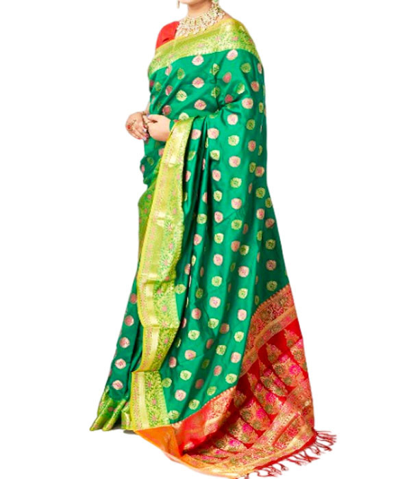 This Saree is Elegantly Woven with Resham, Zari in Floral Motifs and Enhanced with Tassels