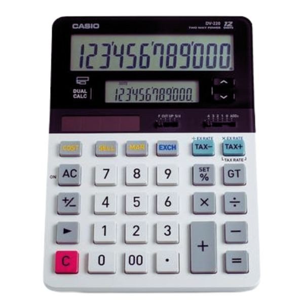 The DV-220 is equipped with robust features such as a 12-digit main display, tax calculation keys, and currency conversion functions, all of which are supported by Casio's renowned quality and reliability. Its compact design and intuitive layout make it a practical tool for both office and home use.