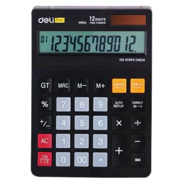 The Deli EM01420 Desk Calculator is a durable, plastic-constructed device designed for efficient and accurate calculations in office, school, or home environments. It features a 12-digit display, allowing for computations involving large numbers. With a blend of practical functions and ergonomic design, this calculator ensures ease of use and reliability.