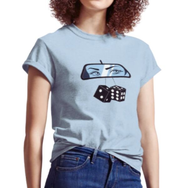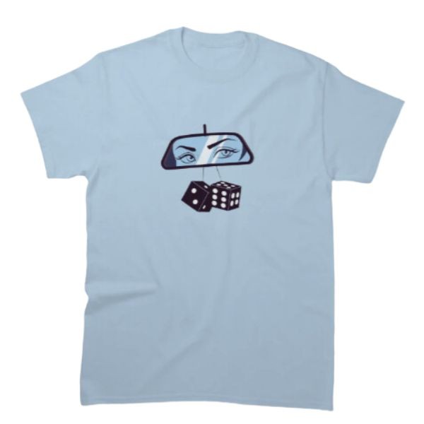 • Front print featuring a detailed illustration of a dipping rearview mirror with fuzzy dice.