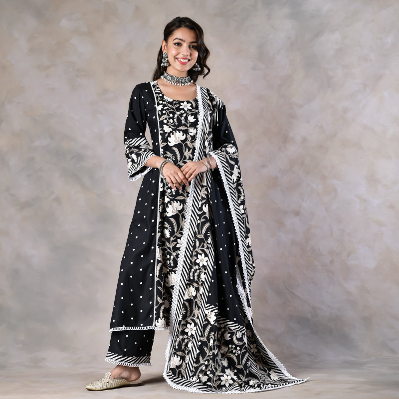কালো রঙের ফ্লোরাল প্যানেলড কুর্তা প্যান্ট এবং দুপাট্টা সেট T-182