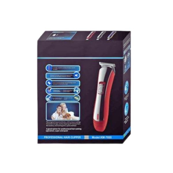 The Kemei KM-7055 is a versatile and reliable beard trimmer designed for precision grooming. With its sleek and ergonomic design, it is suitable for men who value style and convenience. Equipped with four interchangeable clipper attachments of varying sizes, it caters to a range of trimming needs, from detailed beard shaping to hair clipping. The KM-7055 is powered by a rechargeable battery, providing cordless usage for enhanced flexibility. Its sharp, durable blades ensure smooth, even cuts without pulling or tugging.