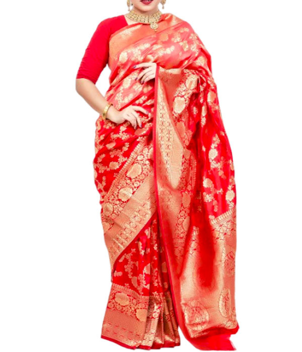 This Wedding Saree is Elegantly Woven with Resham, Zari in Floral Motifs and Enhanced with Tassels