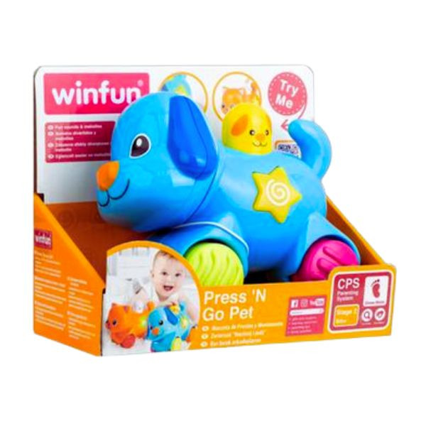 The Winfun Press'N Go Pet Puppy is an interactive, engaging toy designed to entertain and aid in the development of young children. With its friendly, colorful design and simple mechanics, this push-and-go puppy toy is perfect for toddlers who are just learning how to crawl or walk. Children can press down on the puppy’s back to watch it zoom forward, encouraging them to move along and develop their motor skills, hand-eye coordination, and balance.